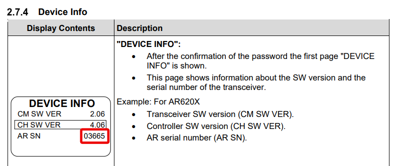 On the subsequently displayed “DEVICE INFO” screen read the serial number from the “AR SN” line. This must be ≥ 03000.