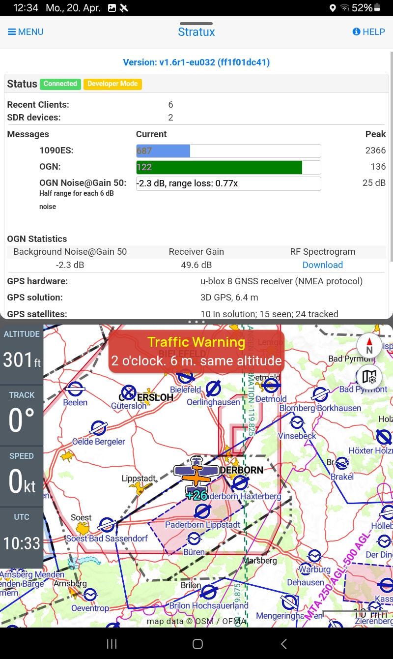 Ich stehe jetzt gerade am Flieger, um das nochmal auszuprobieren. Alles aktiviert, Stratux empfängt Signale. Ich schalte das Flarm von dem Flugzeug neben mir ein….keine Warnung zu hören. Irgendwie läuft es bei mir nicht.