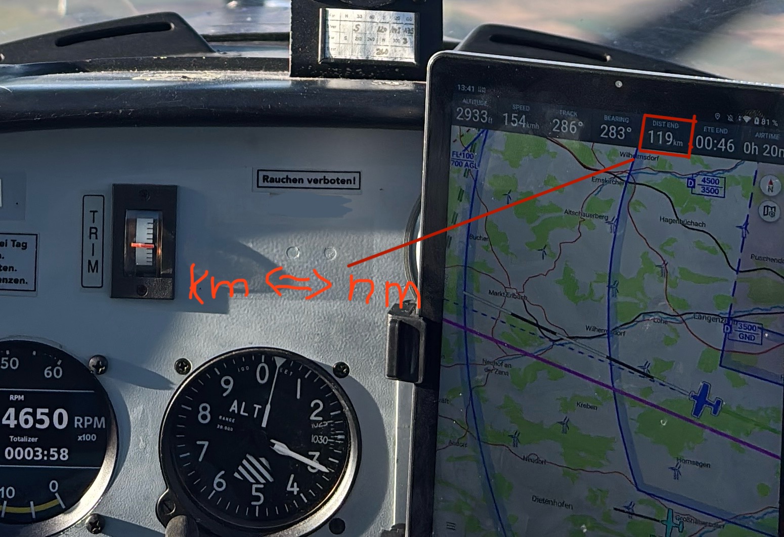 At the top bar (see attached image) it would be useful if tapping it could change the unit, e.g. from km (kilometres) to nm (nautical miles). Default setting km — tapping it would then show the distance in nm and vice versa. That would be especially handy for radio communications.