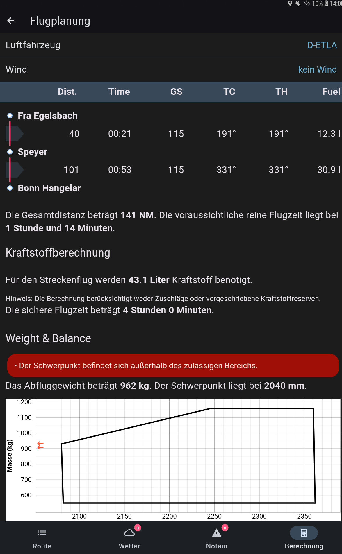 Ok. Das könnte der Fehler sein. Im Wägebericht steht unter Leergewichtsdaten ein Gewicht von 767 kg und ein Hebel von 221,18 cm. Also muss ich statt der 1990 mm wohl 2212 mm eintragen.