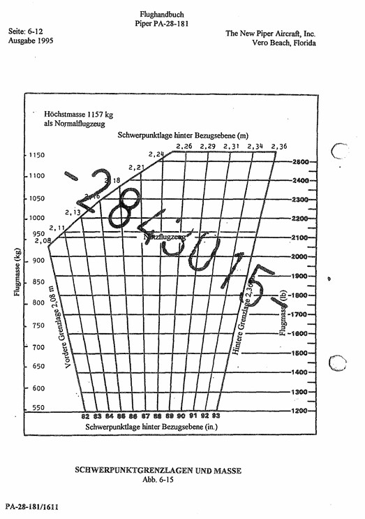 L’ho fatto esattamente così. Ma a quanto pare i valori di base inseriti per una Piper PA28 non sono corretti, perché con un pilota di 90 kg e un rifornimento di 140 litri di UL91, secondo il calcolo il centro di gravità risulta al di fuori dell’intervallo consentito. Se il calcolo fosse corretto, ciò vorrebbe dire che non potrei proprio volare l’aereo da solo, cosa che sicuramente non corrisponde alla realtà. Quindi per ora presumo di aver ricavato i valori di base in modo errato dal POH.