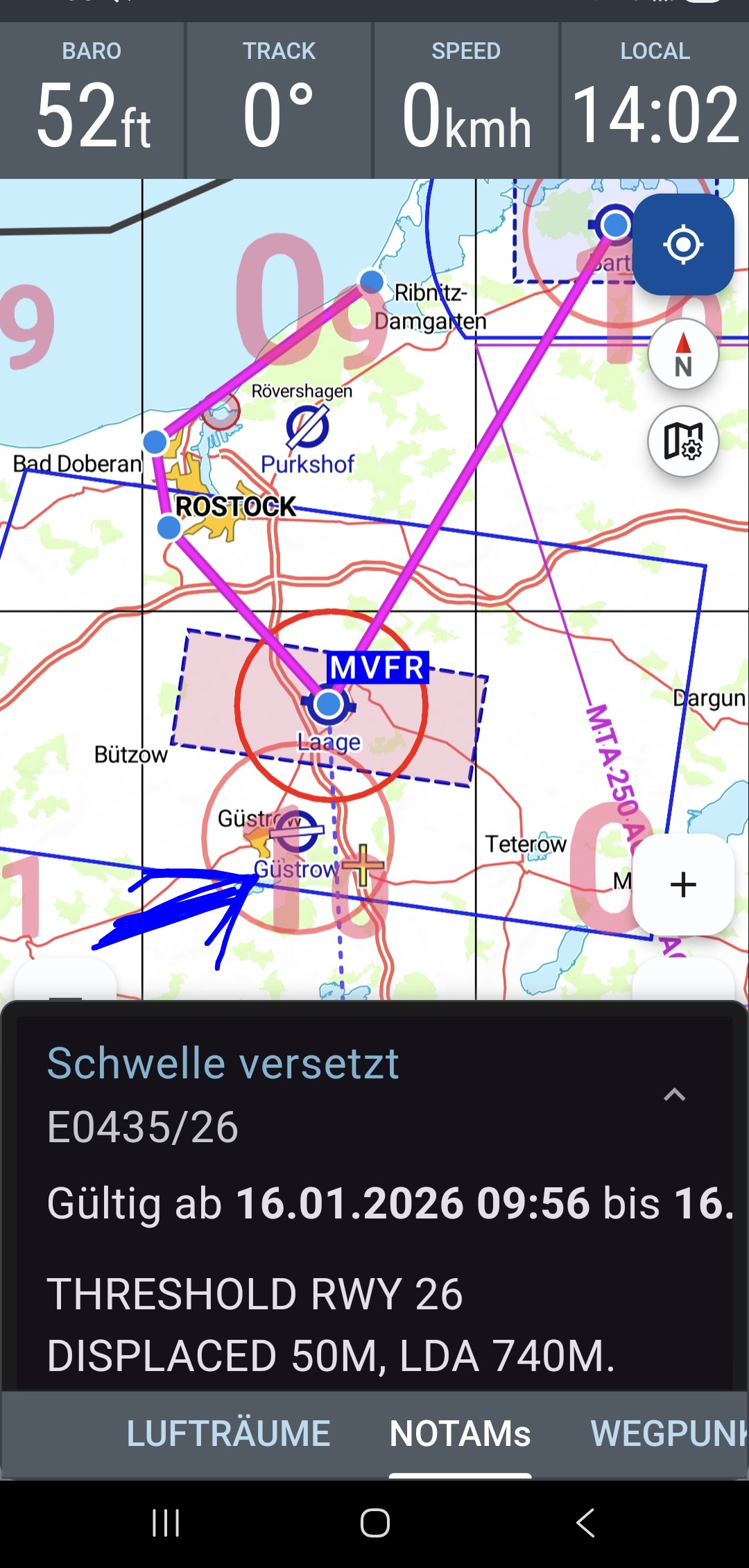 Bei mir erscheint um Güstrow ein Notamkreis. Wenn ich rein tippe um das Notam zu lesen, erfahre ich, daß die Schwelle versetzt ist. ….Ohne das ich einen Alternate definiere???![]()