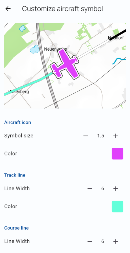 Die aktuelle Standardfarbe des Flugzeugsymbols basiert auf historischen Designentscheidungen, aber Sie können sie problemlos in den VFRnav-Einstellungen ändern.