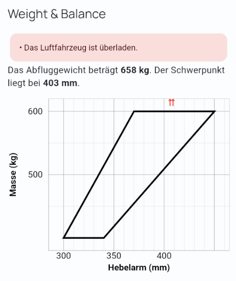 W & B sollte auch eine Warnung anzeigen, wenn das zulässige Gesamtgewicht und/oder die zulässige Schwerpunktlage überschritten werden. Habe das mal getestet und es wird mir zwar das (zu hohe) Gesamtgewicht angezeigt, aber ohne Warnung. Dort steht dann nur “Gesamtgewicht 612 kg”, aber nicht “Achtung” oder ähnliches. Das sollte was rotes aufblinken