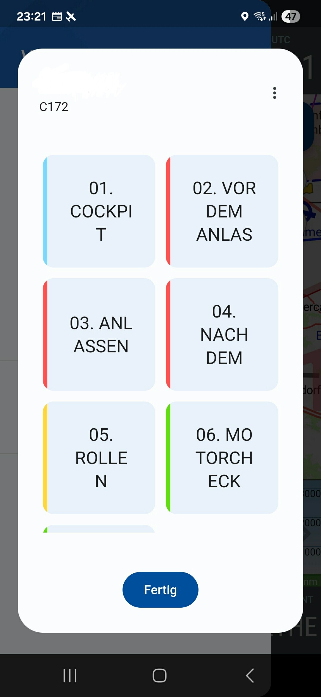 Das ergibt häufig Sinn, manchmal aber nicht - daher werden wir auf diese Implementierung zunächst verzichten. Der Grund: Viele Checklisten-Sektionen bauen in der zeitlichen Abfolge aufeinander auf. Es gibt dann aber auch Sektionen, die unabhängig oder eben nicht zeitlich nah bei der vorherigen Sektion ist. Es Beispiel ist z.B. “Emergency” oder auch “Landung” nach der Sektion “Start”.