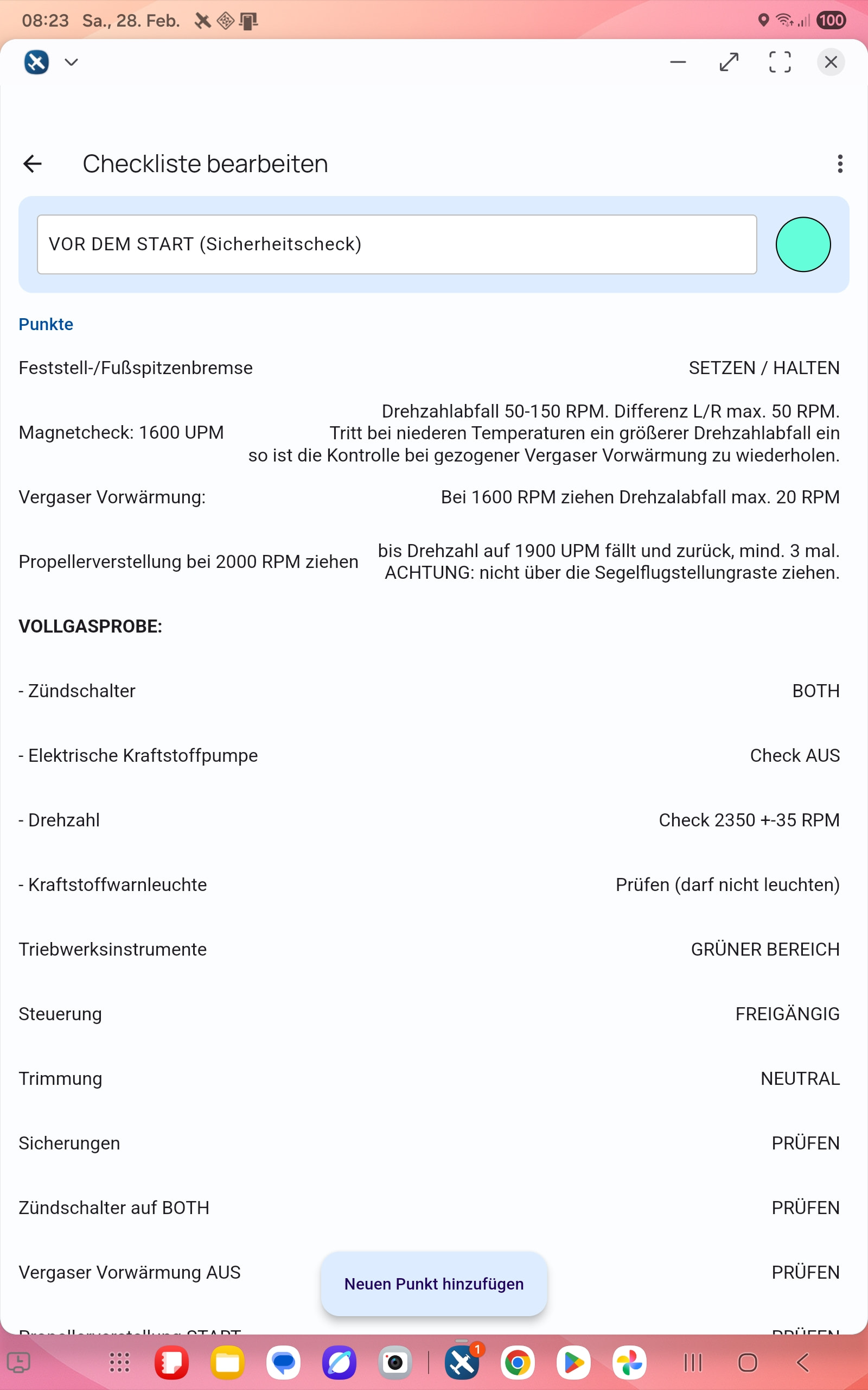 Thanks for implementing the checklist function. I have now entered the checklists for our aircraft and was able to export them for our members and students without any problems. However, I have issues with items that require a bit more text. The texts are cut off depending on portrait or landscape orientation. It also seems that only a maximum of 2 lines is possible. Is there perhaps a way to adjust the font size and/or highlight important items? For example, for the turbine engine “LET THE ENGINE IDLE FOR AT LEAST 2 MINUTES”