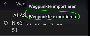 - …wir gehen auf Flugplanung→Meine Wegpunkte und wählen Wegpunkte exportieren. Wie wählen wie oben beschrieben einen geeigneten geteilten Speicherort.