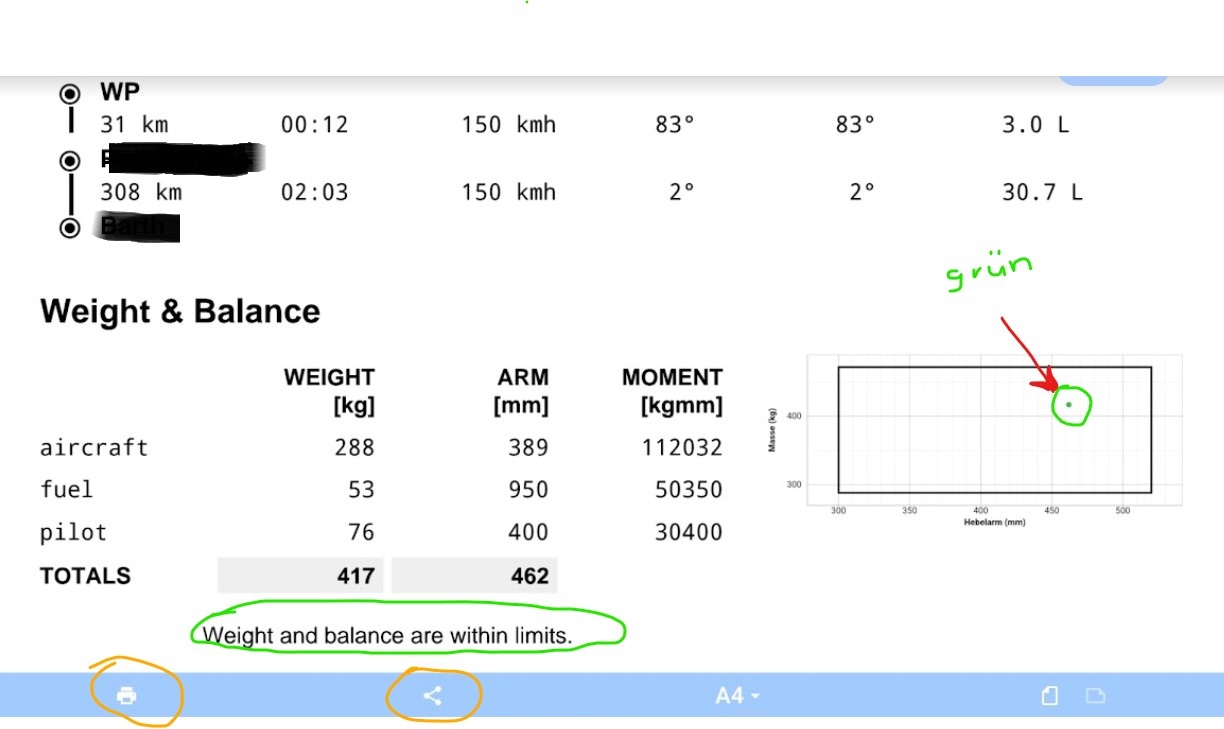 Danach können wir in der Flugvorbereitung unter -Berechnung- uns das PIB generieren lassen und sehen hierzu auch das Weight & Balance integriert. Hier kann man erkennen ob man im Limit liegt (güner Punkt entspr. positioniert) oder außerhalb des Limits (Punkt wird rot entsprechend positioniert).