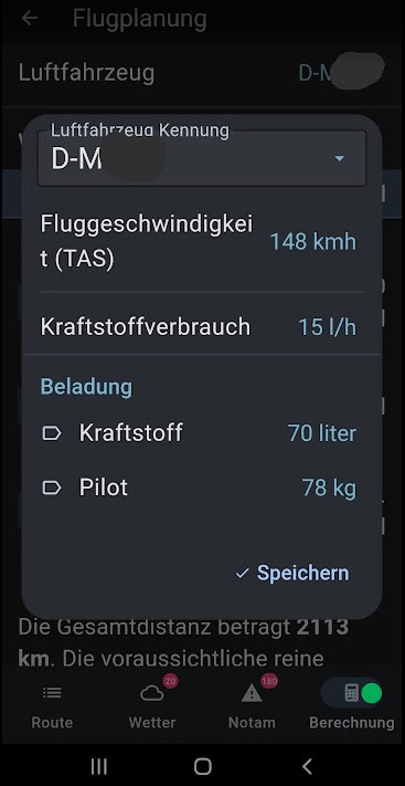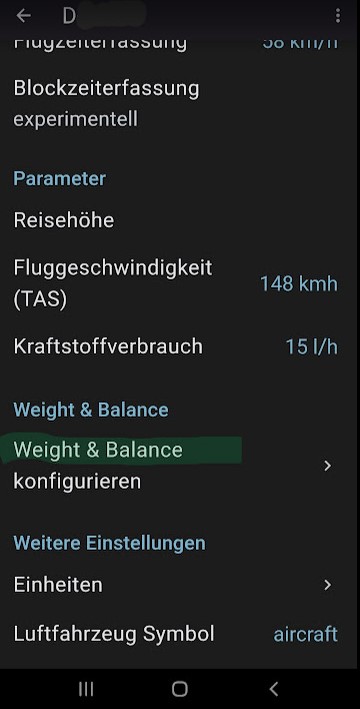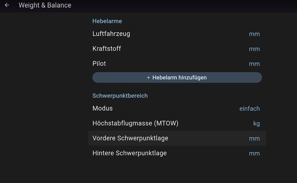 in der folgenden Seite füllen wir alle Daten aus. Die zugehörigen Werte findet man im letzten Wägebericht und im Handbuch zum Luftfahrzeug. Hinweis: bitte ggf. nach unten schieben um weitere Felder zu sehen.